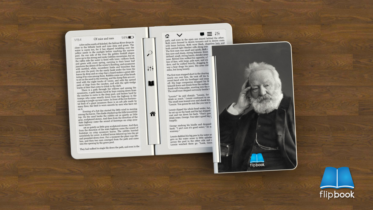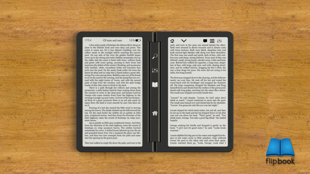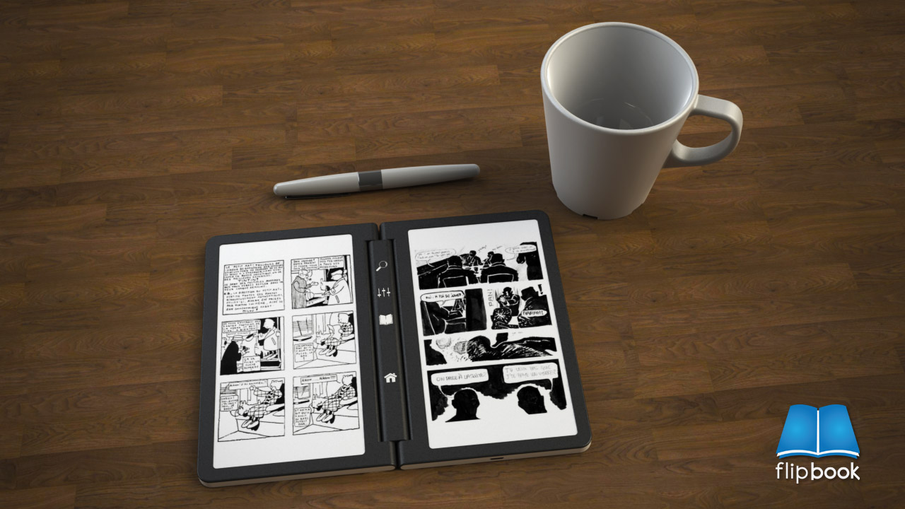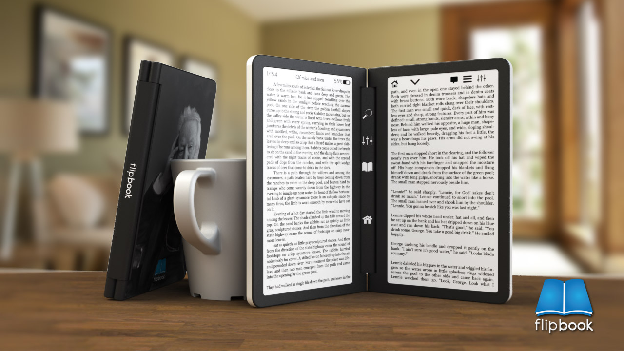 flipBook vypadá jako klasická kniha, když ji otevřete místo textu na papíře na vás bude koukat text ze dvou E Ink displejů. Uprostřed otevřené „knihy“ jsou tlačítka pro vyhledávání, nastavení, návrat do hlavní nabídky. V horních částích displejů jsou různé další tlačítka nebo informace o aktuální stránce v knize, stavu baterie atd.. V konceptu se počítá s dotykovými displeji, protože nikde nejsou tlačítka pro přepínání stránek. Další koncepty naleznete na stránkách designera zde.